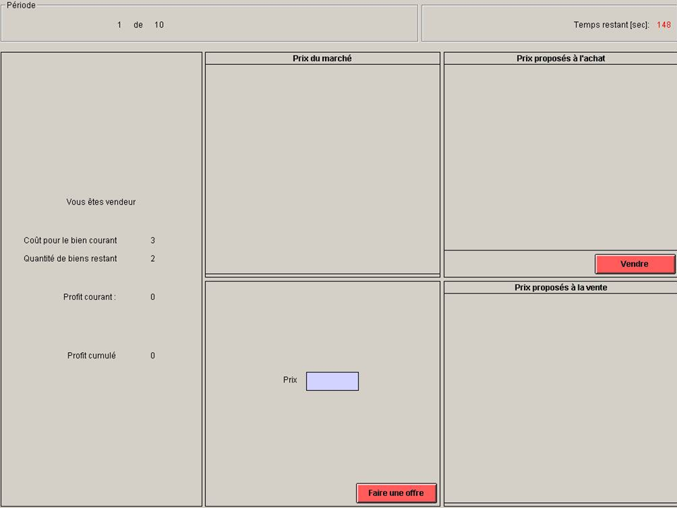 Le jeu de marché réalisé en première année de licence est donc directement inspiré du jeu de double enchère imaginé par Vernon Smith dans les années 50. Bien que ce jeu soit extrêmement connu, je m’en vais lecteur, t’en donner la recette au cas où tu voudrais agrémenter tes longues soirées entre amis d’un jeu d’un genre un peu spécial (ce jeu peut parfaitement être fait sur papier, mais les temps de réalisation sont alors beaucoup plus longs). Au début de la séance, nous expliquons aux vingt participants (en réalité, ils sont le plus souvent une trentaine, mais certains jouent à deux par machine, ce qui ne pose en réalité aucun problème) qu’ils vont être partagés en dix vendeurs et dix acheteurs ayant à acheter ou vendre un même bien sur un marché. Pour ce faire, le marché va ouvrir pendant une certaine période (disons en moyenne 2 minutes), et pendant ce temps, ils pourront acheter ou vendre 0, 1 ou 2 biens. Les propositions de prix de chaque agent sont affichées en temps réel sur l’écran de chaque participant et les transactions effectivement réalisées affichées (le prix auquel chaque unité a été achetée et vendue s’affiche dans une fenêtre spécifique). Par exemple, pour un vendeur, l’interface informatique ressemble à cela (application développée grâce à ZTree, un logiciel gratuit développé initialement par Urs Fischbacher de l’Université de Zürich) :
